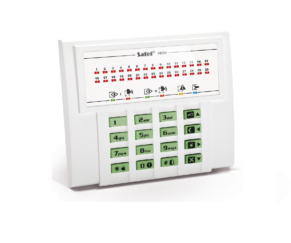 Manipulator VERSA-LED służy do codziennej obsługi systemów bazujących na centralach z serii VERSA. Jest to urządzenie, w którym stan systemu alarmowego jest określany poprzez wskazania diod LED, co daje użytkownikowi jednoznaczną informację o wykonanej czynności. Diody podzielone są na dwie sekcje. Pierwsza (6 diod LED: dwie zielone, dwie czerwone, żółta i niebieska) służy do prezentacji stanu systemu i jego stref. Druga składa się z 30 ponumerowanych diod koloru czerwonego, które wskazują stan wejść oraz ilustrują upływ czasu pozostałego do zakończenia odliczania czasu na wejście lub wyjście w danej strefie.