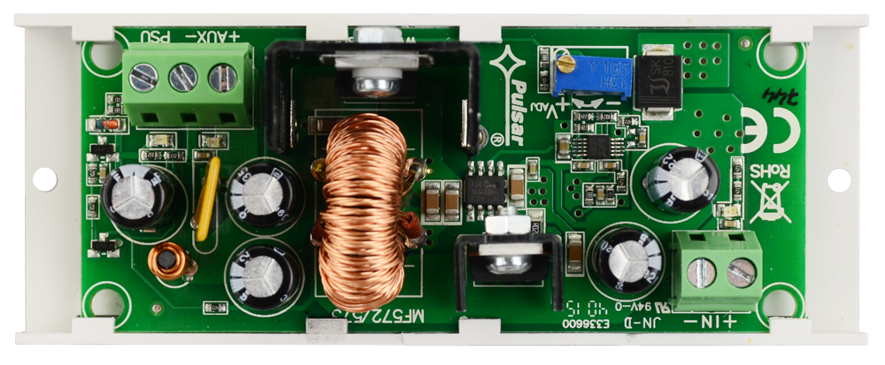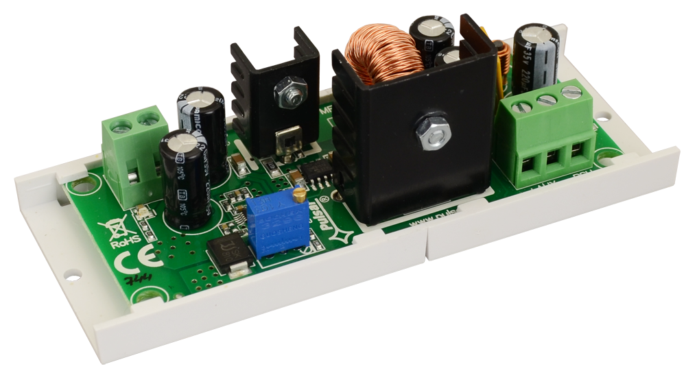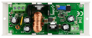Moduł przetwornicy podwyższająco-obniżającej napięcie DC/DC 2A (DC/DC20SE) służy do utrzymania stałej wartości napięcia wyjściowego z przedziału 5÷15V DC ustawionego potencjometrem VADJ, bez względu na wahania w zakresie 9,5V÷16V DC napięcia wejściowego. Gdy napięcie wejściowe jest niższe od żądanego na wyjściu, przetwornica podnosi je do ustawionej wartości. Jeżeli napięcie wejściowe jest wyższe od wymaganego na wyjściu, przetwornica obniża je do żądanej, ustawionej potencjometrem VADJ wartości. Maksymalny prąd obciążenia wynosi Imax=2A (Pmax= 24W). Moduł nie posiada izolacji galwanicznej pomiędzy wej/wyj (IN-AUX), pracuje na wspólnym potencjale „masy” (0V) (zaciski IN- oraz AUX- są połączone galwanicznie = zacisk wspólny).