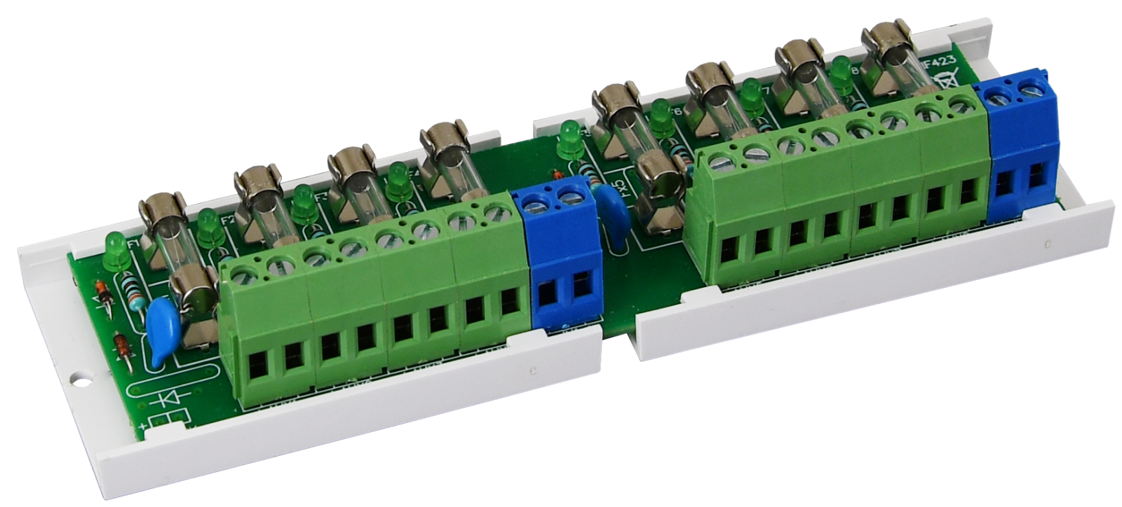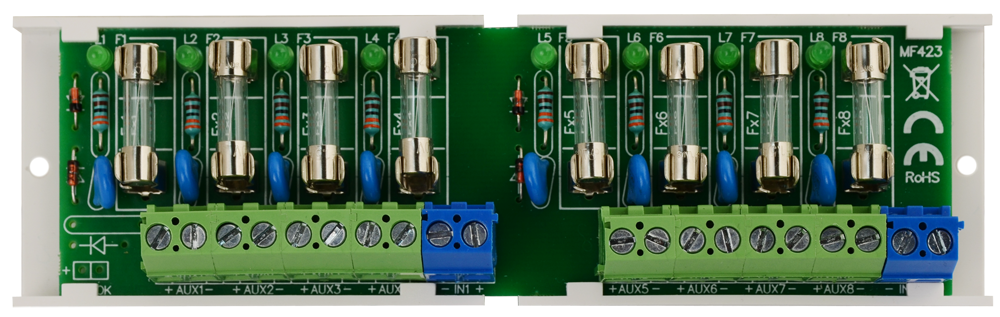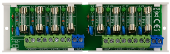 Moduł bezpiecznikowy LB8/8x1,5A/2,5/FTA przeznaczony jest do rozdziału zasilania w systemach niskonapięciowych wymagających napięcia z zakresu 10V÷30V DC lub 10V÷24V AC (np. zasilacz buforowy, transformator itp.). Posiada dwa wejścia zasilania oraz osiem niezależnych, torów zasilania zabezpieczonych bezpiecznikami topikowymi 1,5A. Zadziałanie bezpiecznika sygnalizowane jest przez zgaszenie odpowiedniej diody LED modułu: L1 dla AUX1, L2 dla AUX2 itd. Dodatkowo każde z wyjść zabezpieczone jest warystorem chroniącym zasilacz oraz odbiorniki przed skutkami wystąpienia przepięć w układzie zasilania. Moduł jest przystosowany do podłączenia 2 przewodów o maksymalnym przekroju 2,5mm.