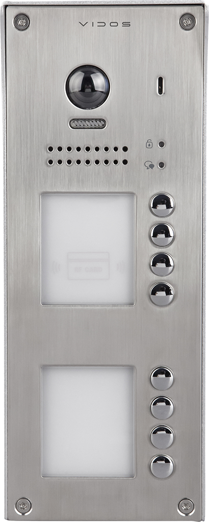 S1108A to ośmioabonamentowa stacja bramowa do systemów wideodomofonowych z rodziny Vidos DUO. Urządzenie operuje na bazie podświetlanego szyldu informacyjnego z czytnikiem kart zbliżeniowych RFID 125kHz, kolorowej kamery wideo 2Mpx o szerokim kącie widzenia 170 stopni, wbudowanego mikrofonu oraz głośnika. Panel umożliwia nie tylko zdalne wywołanie i rozmowę z abonentem końcowym, ale pozwala również na samodzielne uzyskanie wstępu na teren posesji przy użyciu breloków i kart dostępu. Urządzenie posiada 1 wyjście przekaźnikowe oraz obsługuje do 4 monitorów / unifonów na lokal.