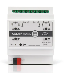 Pozwala również sterować ruchem okien z napędem elektrycznym. Moduł KNX-BSA12H przeznaczony jest do sterowania urządzeniami z silnikiem 230 V AC. Posiada dwa wyjścia fizyczne, którym odpowiadają dwa kanały logiczne. Każdy kanał umożliwia sterowanie jednym, wybranym typem zasłony lub oknem.
