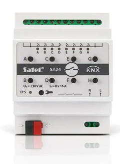 Moduł KNX-SA24 jest uniwersalnym aktorem przełączającym, który umożliwia sterowanie urządzeniami elektrycznymi (oświetlenie, wentylatory). Telegramy, odbierane przez moduł od różnego rodzaju urządzeń KNX (np. od czujników), są zamieniane na konkretne działania, takie jak włączenie/wyłączenie światła lub wentylatora.