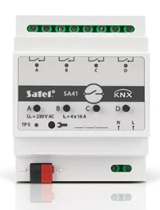 Moduł KNX-SA41 jest uniwersalnym aktorem przełączającym, który umożliwia sterowanie urządzeniami elektrycznymi (oświetlenie, wentylatory). Telegramy odbierane przez moduł od różnego rodzaju urządzeń KNX (np. od czujników) są zamieniane na konkretne działania, takie jak włączenie/wyłączenie światła lub wentylatora.