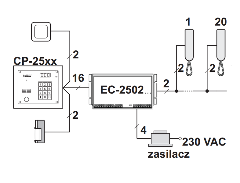 - Ilość przewodów łączących panel zewnętrzny i unifon: 2 + 2