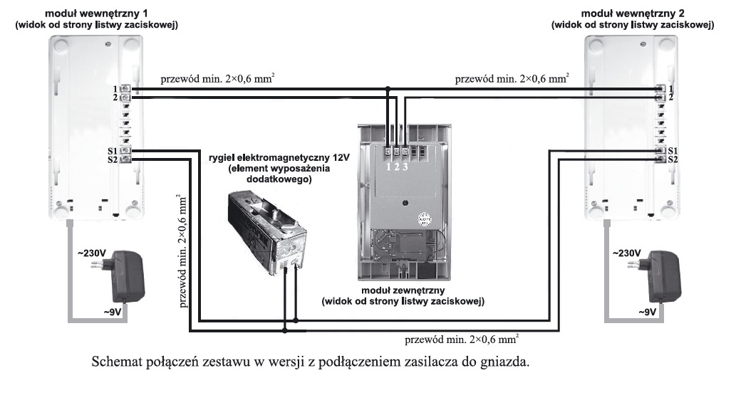 - Ilość przewodów łączących panel zewnętrzny i unifon: 3 + 2