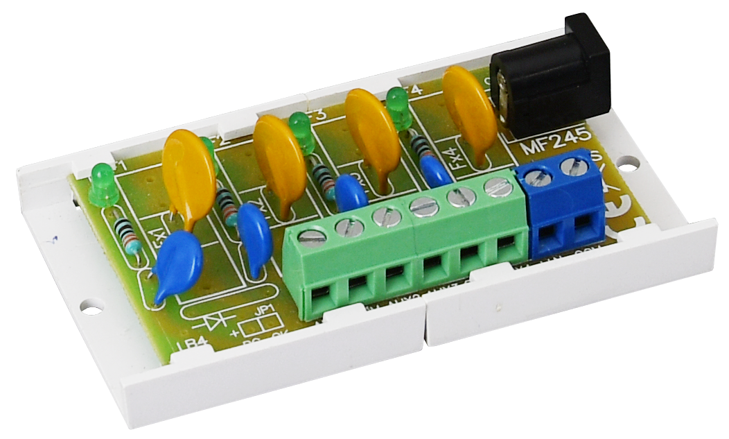 Moduł bezpiecznikowy przeznaczony jest do rozdziału zasilania w systemach alarmowych niskonapięciowych wymagających napięcia z zakresu: 10V÷ 30V DC. Posiada dwa wejścia zasilania: złącze śrubowe i gniazdo DC 5,5/2,1 oraz cztery niezależnie zabezpieczone bezpiecznikami polimerowymi PTC 1A wyjścia zasilania AUX1÷AUX4. Zadziałanie bezpiecznika PTC sygnalizowane jest poprzez zgaszenie odpowiedniej diody LED modułu: L1 dla AUX1, L2 dla AUX2 itd. Dodatkowo każde z wyjść zabezpieczone jest warystorem chroniącym zasilacz oraz odbiorniki przed skutkami wystąpienia przepięć w układzie zasilania.