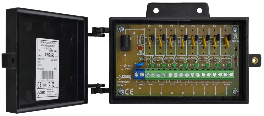 Moduł bezpiecznikowy przeznaczony jest do rozdziału zasilania w systemach alarmowych niskonapięciowych wymagających napięcia z zakresu: 10V÷ 30V DC. Posiada dwa wejścia zasilania: złącze śrubowe i gniazdo DC 5,5/2,1 oraz cztery niezależnie zabezpieczone bezpiecznikami polimerowymi PTC 1A wyjścia zasilania AUX1÷AUX8. Zadziałanie bezpiecznika PTC sygnalizowane jest poprzez zgaszenie odpowiedniej diody LED modułu: L1 dla AUX1, L2 dla AUX2 itd. Dodatkowo każde z wyjść zabezpieczone jest warystorem chroniącym zasilacz oraz odbiorniki przed skutkami wystąpienia przepięć w układzie zasilania.
