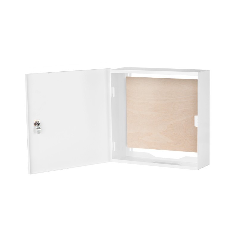 Uniwersalna, metalowa obudowa natynkowa to idealne rozwiązanie dla dodatkowego zabezpieczenia różnego typu urządzeń, dyskretnego i schludnego ich ukrycia oraz stabilnego i bezpiecznego montażu. Obudowa TPR wyposażona jest w sklejkę o grubości 8 mm, osadzoną na tylnej ścianie, co ułatwia montaż urządzeń wewnątrz obudowy.