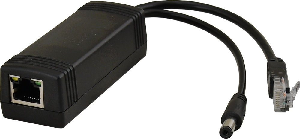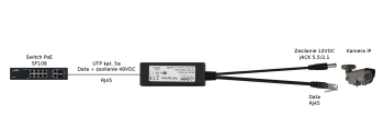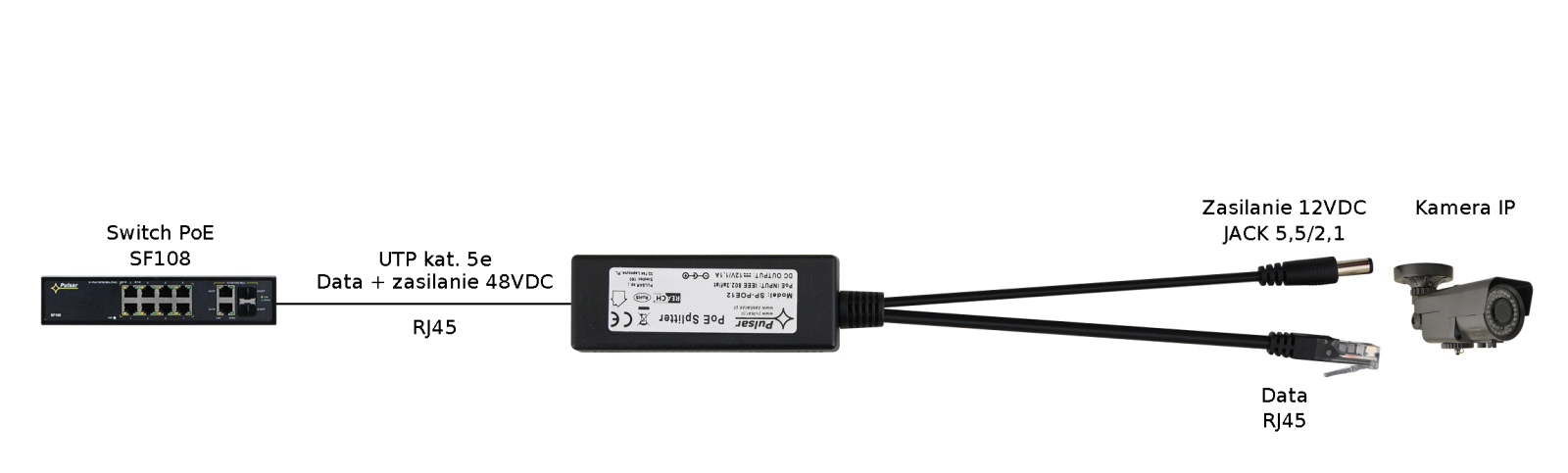 Splitter SP-POE12 przeznaczony jest do zasilania kamer IP, które wymagają napięcia zasilającego 12 V DC. Zbudowany jest w oparciu o wysokosprawną przetwornicę DC/DC obniżającą napięcie z zakresu 44-57V DC do wartości 12 V DC. Splitter może być zasilany zarówno z urządzeń zgodnych ze standardem PoE (np. Switch PoE) jak również z pasywnych zasilaczy PoE wstrzykujących napięcie do par 4/5 i 7/8, które nie biorą udziału w transmisji danych. Na wejście modułu (gniazdo RJ-45) podawane jest napięcie zasilania (POWER) oraz dane (DATA). Na wyjście (wtyk RJ-45) przesyłane są jedynie dane (DATA), natomiast napięcie zasilania 12 V DC do kamery dostępne jest na wtyku DC 5,5/2,1.