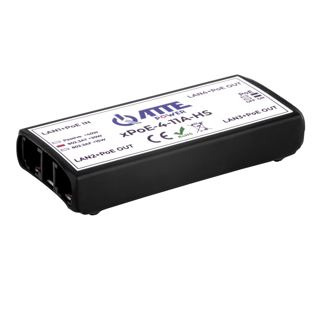 Extender xPoE-4-11A-HS to urządzenie przeznaczone do zwiększenia odległości przesyłu zasilania PoE oraz danych Ethernet za pomocą skrętki UTP kat. 5/5e o kolejne 100m. Extender jest zasilany ze switcha PoE lub innego urządzenia zgodnego ze standardem PoE (wejście PoE IN IEEE802.3af/at lub Passive PoE). Do przesyłu zasilania na portach PoE OUT1, PoE OUT2, PoE OUT3 wykorzystane są pary 4/5 (+) 7/8(-) (Passive PoE), które zgodnie ze standardem sieci Ethernet nie są używane do transmisji danych (transmisja danych odbywa się z wykorzystaniem pary 1/2 i 3/6).