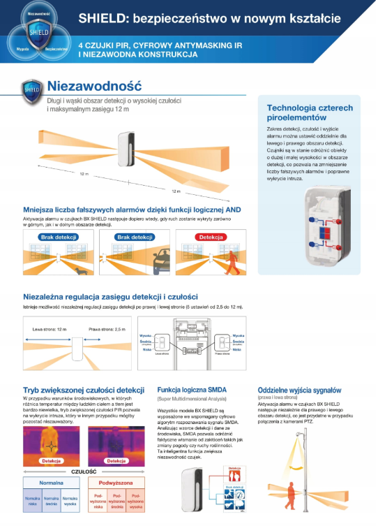 Czujki BX Shield to doskonałe rozwiązanie do wykrywania ludzi w bezpośrednim obrębie domu czy biurowca. Urządzenia są wyposażone w cztery piroelementy, po dwa z każdej strony. Obszary detekcji z prawej i lewej strony można skonfigurować całkowicie niezależnie od siebie, aby uzyskać pełną kontrolę nad nadzorowanymi miejscami.