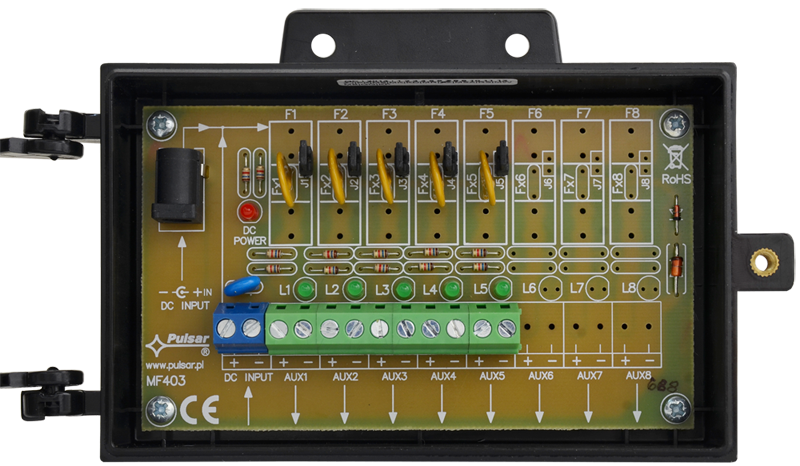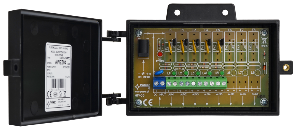 Moduł bezpiecznikowy LBC5 przeznaczony jest do rozdziału zasilania w systemach CCTV wymagających napięcia z zakresu 10V ÷ 30V DC. Posiada dwa wejścia zasilania: złącze śrubowe i gniazdo DC 5,5/2,1 oraz pięć niezależnie zabezpieczonych bezpiecznikami polimerowymi PTC 1A wyjść zasilania AUX1 ÷ AUX5. jest w zworki J1 ÷ J5 odłączające zasilanie wyjść AUX1 ÷ AUX5 (zacisk „+”). Moduł wyposażony Zadziałanie bezpiecznika PTC sygnalizowane jest przez zgaszenie odpowiedniej diody LED modułu: L1 dla AUX1, L2 dla AUX2 itd. Dodatkowo wejście modułu zabezpieczone jest warystorem chroniącym zasilacz przed skutkami wystąpienia przepięć w układzie zasilania.