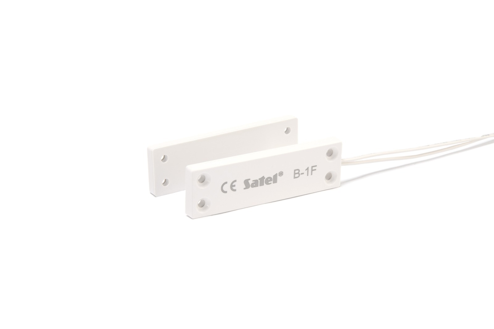 Czujki magnetyczne umożliwiają wykrycie otwarcia drzwi, okien itp. Płaska czujka kontaktronowa B-1F przeznaczona jest do montażu powierzchniowego (przykręcana do podłoża). Długość przewodu : 40cm.