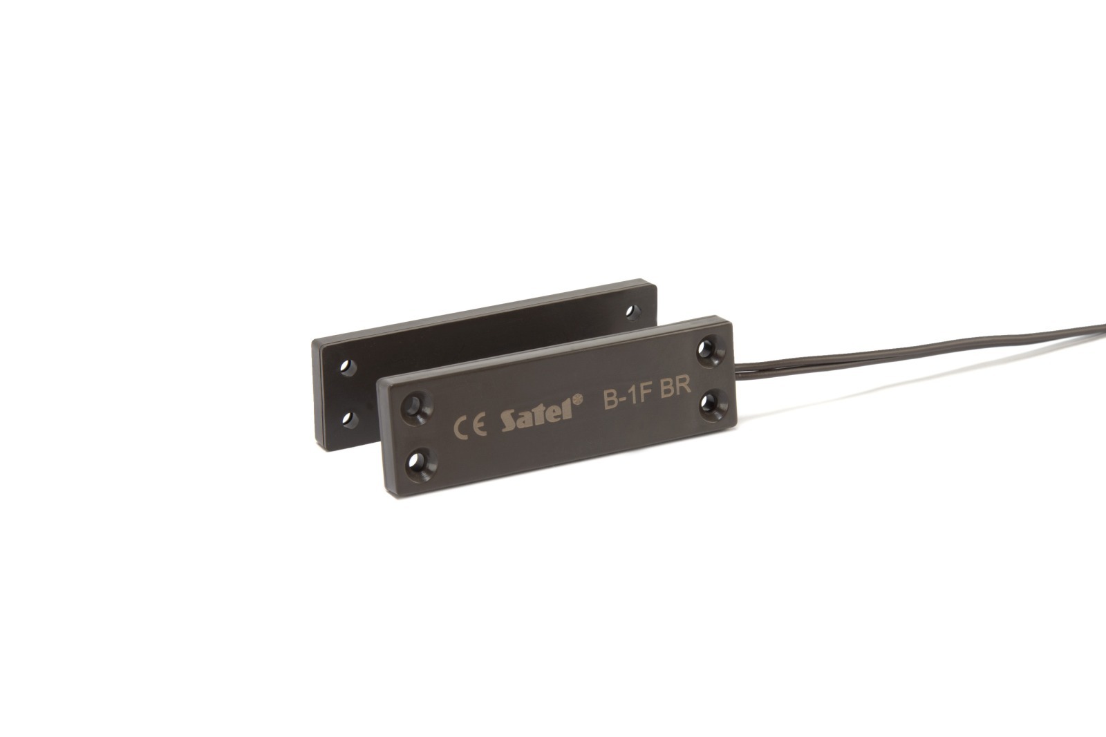 Czujki magnetyczne umożliwiają wykrycie otwarcia drzwi, okien itp. Płaska czujka kontaktronowa B-1F BR przeznaczona jest do montażu powierzchniowego (przykręcana do podłoża). Długość przewodu : 40cm.