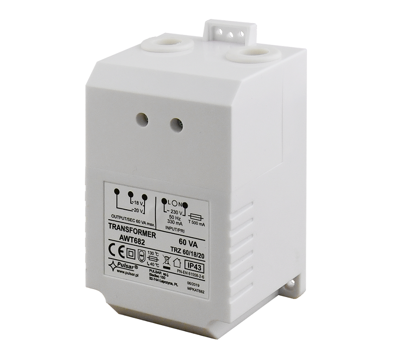 Transformator AWT682 jest dedykowany do zasilania urządzeń wymagających napięcia AC. Zamienia napięcie sieciowe 230V AC, na napięcie 18V AC lub 20V AC. Moc odbiorników dołączonych do zacisków transformatora nie może być większa od jego mocy znamionowej. Przeznaczony do zasilania systemów alarmowych, których moc skuteczna nie przekracza 60VA.