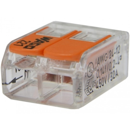 Szybkozłączka instalacyjna WAGO uniwersalna serii 221 COMPACT wyposażona w zacisk CAGE CLAMP przeznaczona do łączenia przewodów jednodrutowych oraz wielodrutowych. Produkt ten znajduje zastosowanie przy łączeniu przewodów w puszkach elektroinstalacyjnych, technice oświetleniowej oraz w szafkach rozdzielczych i innych pracach elektroinstalacyjnych.